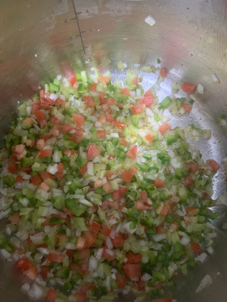 1 cup of onions (white). 1/2 cup green bell peppers (diced). 1/2 cup of tomatoes. 1/2 cup of celery. 1/2 tsp salt. 1/2 tsp pepper. The start to making great Shrimp Etouffee.